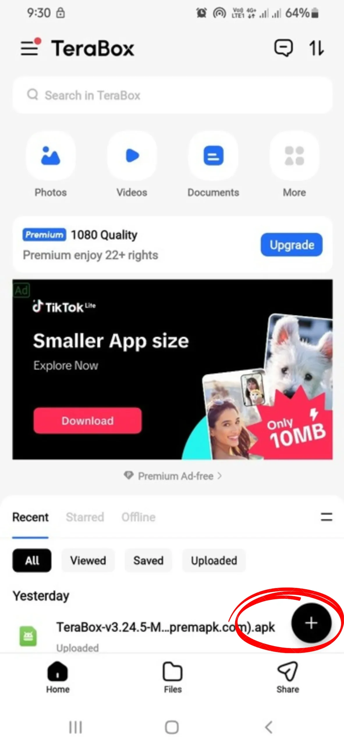 - Note: Video uploading from the Terabox mobile app is a Premium feature. However, you can read our detailed article on how to upload a video using the Terabox mobile app without a premium subscription. This method allows you to add video files with the mobile app without hassle.